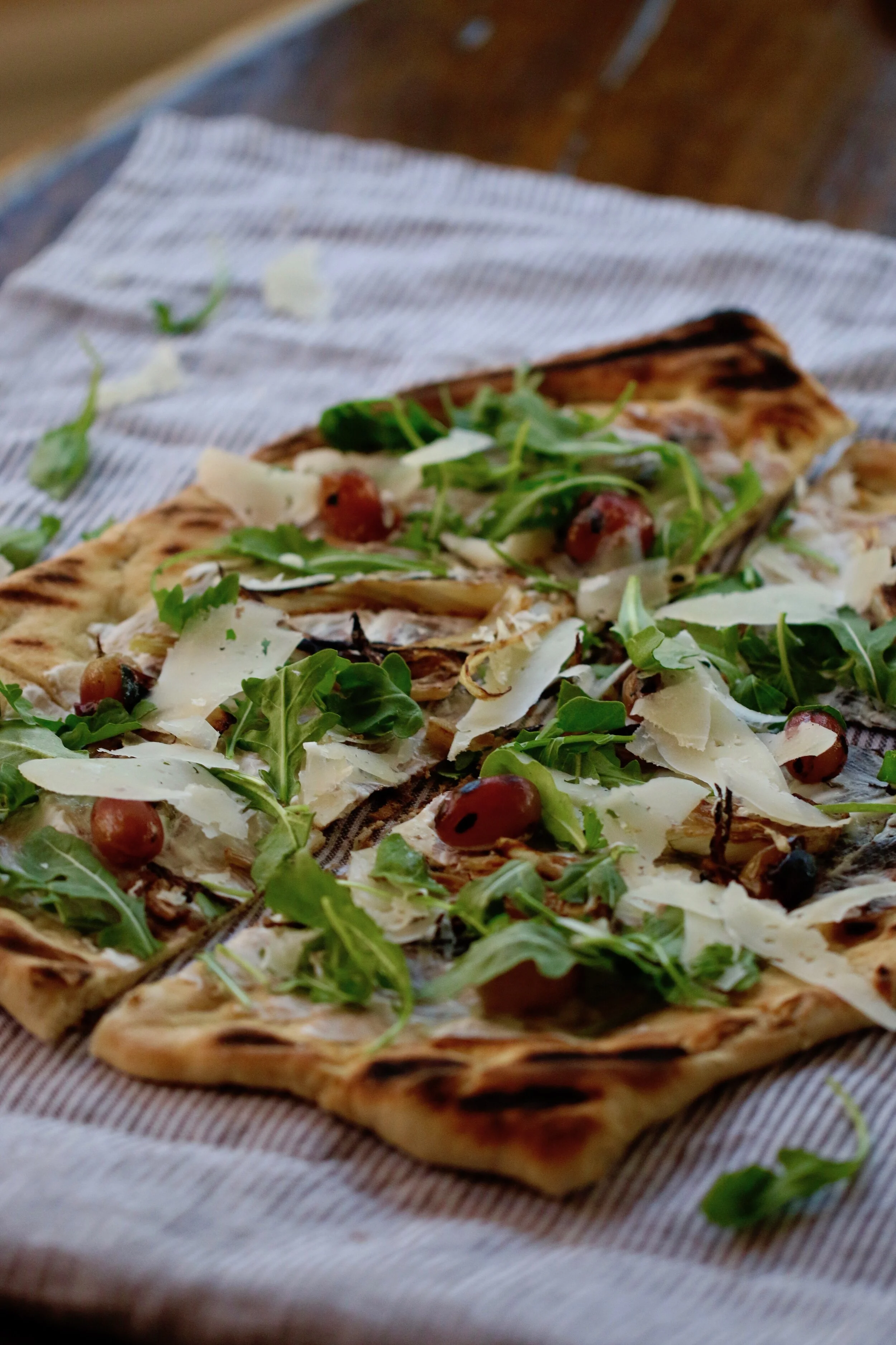 Remove flatbread from grill, brush each flatbread with about 2 tablespoons of quark or yogurt, top with grapes, fennel, arugula, cheese, and sprinkle with a bit of salt and a squeeze of fresh lemon juiece, to taste.